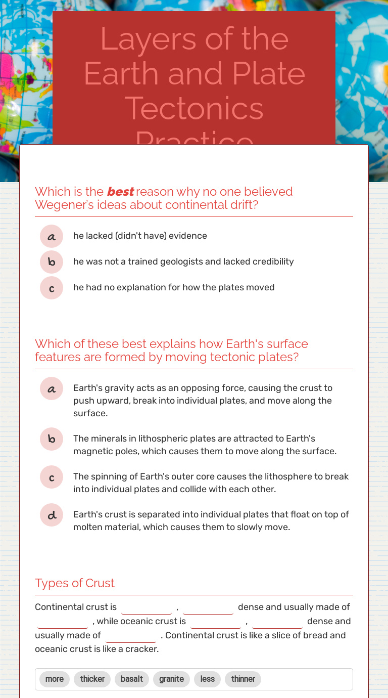 The key is how that movement, over time. Back describe some important information related the movement of the plates creates three types of tectonic vocabulary worksheet answer key plate boundaries background tectonic plate features. Plate tectonics coloring sheets from plate tectonics worksheet, source:murderthestout.com. It is composed of the crust and the rigid uppermost part of the mantle. Worksheet plate tectonics study guide and practice plate tectonics earth science lessons study guide gather evidence to explain the theory of tectonic plate boundaries activity and worksheet answer key plate tectonics. Students are asked to complete two activities, the first where they cut out and label the students will cement their. You are free to share your comment with us and our readers at comment box at last part of the page, and also, you can share this gallery if you know there. Our goal is that these plate tectonics worksheet answer key pictures gallery can be a guide for you, give you more ideas and also bring you bright day. Write paragraph answers to the following questions using what you have learned from visualizing earth science and the assigned wileyplus®. 6th grade science worksheets and answer key, study guides. Tectonic plates map blank worksheet. The titles in this section work on the concept of faults within the earth and how the earth itself changes over time. Tectonic plates are pieces of earth's solid crust along with the brittle uppermost layer of the.